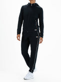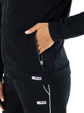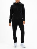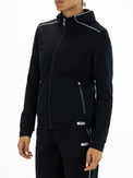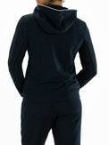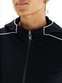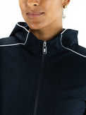 Donkerblauwe hooded trainingsjack voor dames. Dit jack valt op door de contrasterende biezen langs de capuchon en bij de schouders. Ook heeft het gekleurde ritsen in de zijzakken en een gekleurd trekkoord in de tailleband. Combineer dit jack met multisportbroek Kalessi tot een stijlvolle sportoutfit.