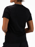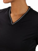 Een luchtig dames t-shirt in de zomerse trendkleur sorbet pink met een all-over geperforeerd design. De iets langere mouwen en de met een contrasterende bies afgezette v-hals voegen elegantie toe aan dit functionele sportitem.
