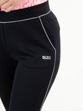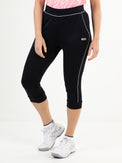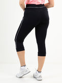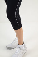 Deze sportieve, donkerblauwe capri broek is gemaakt van comfortabel foamy interlock materiaal. De pintuck naden en contrasterende pipings geven deze dames capri een gestroomlijnde look.