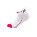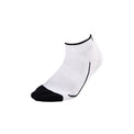 2-pack dames sportsokken in een combinatie van wit met donkerblauwe hielstukken, tenen en strepen langs de voet en langs de enkelboord. Ook hebben deze sokken een zwarte print met het Sjeng Sports logo. Dankzij een behandeling met Polygiene blijven ze lekker lang fris ruiken.