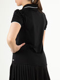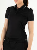 Deze elegante dames polo met pofmouwen en een geperforeerd patroon heeft een stijlvolle uitstraling. Dit shirt is gemaakt van zwarte single jersey. De ribkraag met contrasterende biezen voegt een klassieke touch toe aan dit moderne ontwerp.