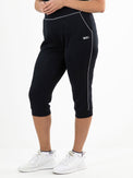 Deze sportieve, donkerblauwe capri broek is gemaakt van comfortabel foamy interlock materiaal. De pintuck naden en contrasterende pipings geven deze plus size dames capri een gestroomlijnde look.