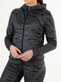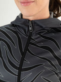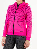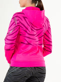 Deze stijlvolle dames hoodie van powerstretch in de trendy kleur pink glo combineert comfort met een sportieve uitstraling. De body en de mouwen hebben een opvallende tijgerprint. De geprinte biezen langs de taille en op de mouwen zorgen voor een dynamische look.