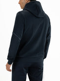 Donkerblauw hooded trainingsjack voor heren. Dit sportieve jack heeft een dubbellaags capuchon en twee gesealde zakken met ritssluitingen in een contrasterende kleur. Ook heeft dit trainingsjack details van siliconenprint en het Sjeng Sports logo op de borst.