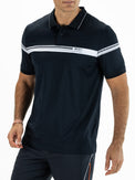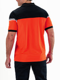 Heren poloshirt van ultralicht ripstop materiaal in de kleur bright tangerine in combinatie met een donkerblauwe bovenkant. Over de body en mouwen van deze polo lopen horizontale inzetten van single jersey met daarop siliconen print. Langs de kraag en de mouwboorden heeft dit shirt contrasterende strepen.