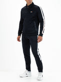 Donkerblauwe heren multisportbroek van powerstretch materiaal met een geborstelde binnenkant. Langs de pijpen van deze broek lopen contrasterende inzetten met siliconen print. Onderaan bij de kuiten zitten ritssluitingen en de broek heeft een achterzak en boorden bij de enkels.