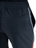 Donkerblauwe heren multisportshort van geweven stretch materiaal met smalle contrasterende biezen en perforatie aan de zijkant bij het bovenbeen. Deze sportieve short heeft een achterzak met ritssluiting.