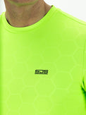 Trendy heren t-shirt van single jersey in de kleur shocking green met een print in honingraat patroon. Dit shirt heeft contrasterende naden aan de zijkant en op de schouders contrasterende strepen en het logo van Sjeng Sports. Je kunt dit shirt goed combineren met trainingsjack Malek dat een soortgelijke print heeft.