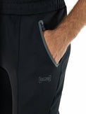 Zwarte multisportbroek voor heren. Deze comfortabele trainingsbroek is gemaakt van dubbelgebreide tricot met pintucks. De broek heeft steekzakken met ritssluitingen, een elastische tailleband en halverwege de pijp een print met het Sjeng Sports logo.