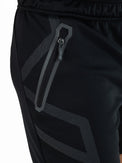Heren short van zwarte powerstretch met een print met geometrisch patroon. Deze fijne multisportshort heeft steekzakken met ritssluitingen afgebiesd met seal-on tape en een elastische tailleband met trekkoord. Dezelfde geometrische print vind je ook op t-shirt Nielson, zodat je de twee tot een geheel kunt combineren.