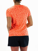 Kom goed voor de dag op de tennisbaan of in de sporthal in dit stijlvolle dames t-shirt met v-hals. Dit shirt van single jersey in de kleur vibrant orange heeft een all-over print. De body is van een dubbele laag stof en de mouwen hebben een iets langere lengte.