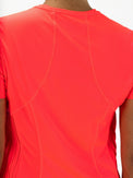 Stijlvol dames t-shirt van lichtgewicht single jersey in de kleur laser pink met pintucks aan de zijkanten. In dit fijne t-shirt kom je goed voor de dag tijdens je training, maar ook wanneer je het gewoon zo draagt in je vrije tijd.