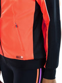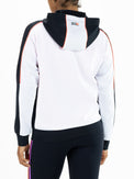 Sportief hooded trainingsjack voor dames. Dit comfortabele loose fit jack is gemaakt van foamy interlock materiaal met als hoofdkleur wit. Het jack heeft langs de schouders, mouwen en in de capuchon inzetten met een all-over print in een contrasterende kleur. De capuchon is van een dubbele laag stof.