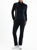 Donkerblauw dames trainingsjack van powerstretch materiaal met een geborstelde binnenkant. Opvallende details aan dit jack vind je in de contrasterende biezen die de taillelijn mooi accentueren. Met dit jack kom je goed voor de dag op de tennisbaan of bij andere takken van sport.