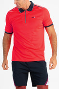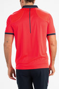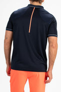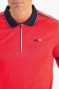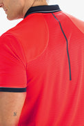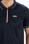 Donkerblauw gestreepte pique polo voor heren. Dit poloshirt heeft inzetten van mesh aan de achterkant bij de schouders en langs de schoudernaden loopt een bies van seal-on tape. Langs de kraag en de mouwboorden loopt een contrasterende streep.