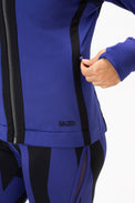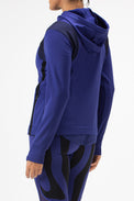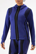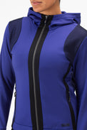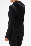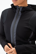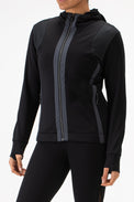Hooded trainingsjack voor dames. Dit sportieve jack is gemaakt van zwarte powerstretch. Bij de schouders van dit trackjacket zitten gestreepte inzetten en in de mouwboorden zitten handige gaten voor je duimen.